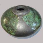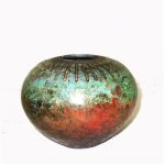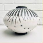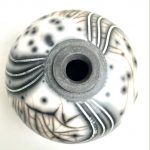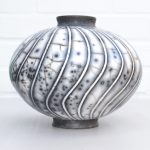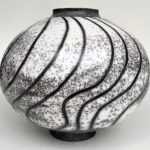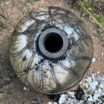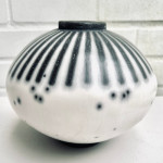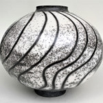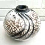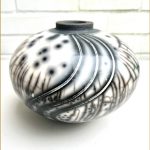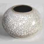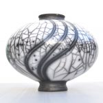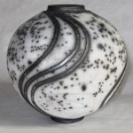 For raku I use a specialist, thermal-shock resistant, clay body and after burnishing the surface, apply terra sigillata and bisque fire the pot. After the bisque firing the pot is decorated and a coat of resist-slip is applied and covered with a thin white-crackle or copper glaze or a resist-slip for naked raku. The pot is then fired in a raku kiln to 1000 degrees centigrade and taken from the kiln and buried in sawdust when red hot. Smoke blackens the unglazed areas and seeps through the crackle in the glaze. On cooling the resist-slip and glaze fall away revealing the crackle patterns on the clay surface.